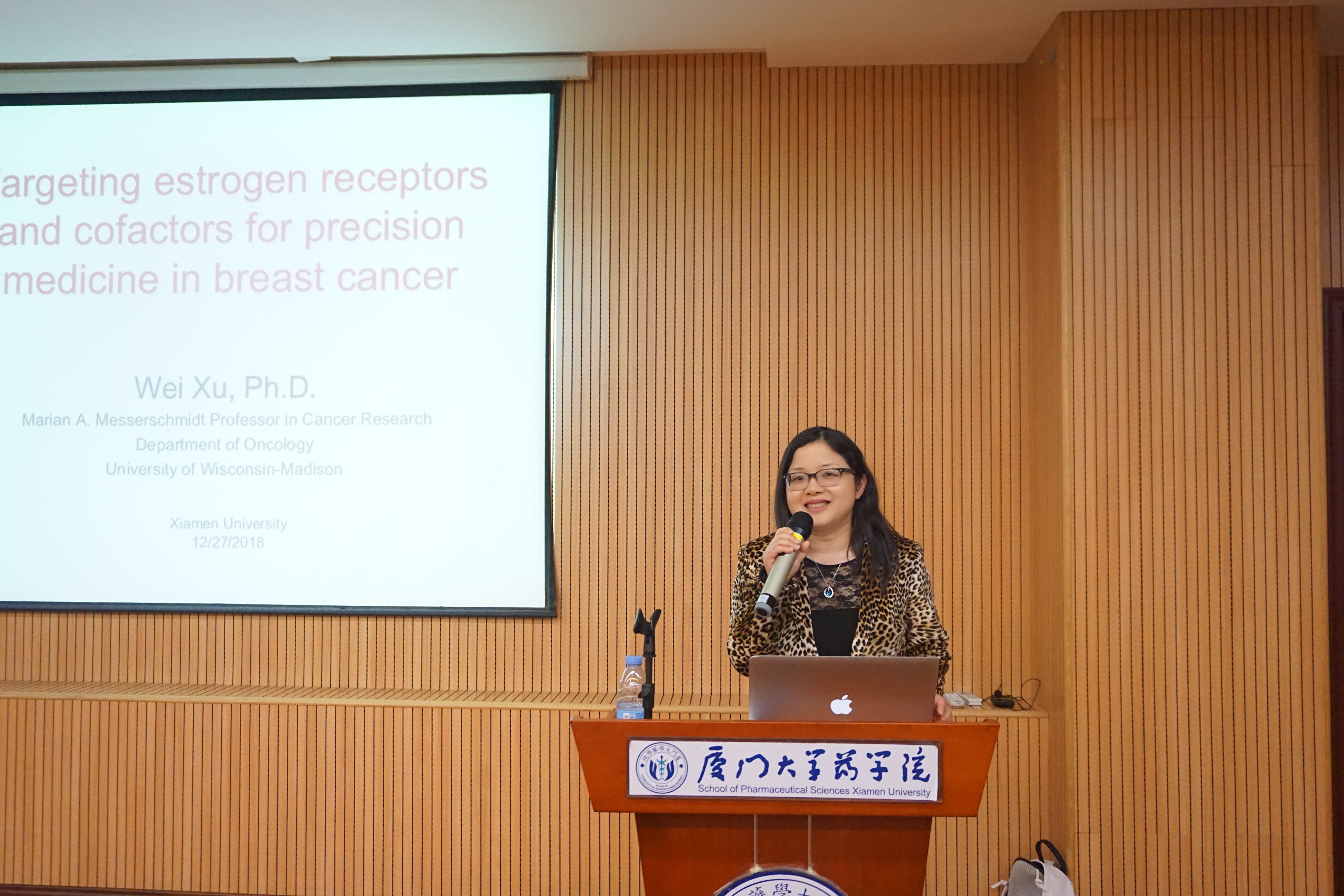 12月27日上午,美国威斯康星大学麦迪逊分校肿瘤学部许伟教授应邀莅临福建省药物新靶点研究重点实验室,作了题为“Targeting estrogen receptor and cofactors for the treatment of breast cancer”的学术讲座。重点实验室刘文教授主持了讲座。刘教授首先对许伟教授的到来表示了诚挚的感谢和热烈的欢迎,继而介绍了其取得的一系列重要研究成果。