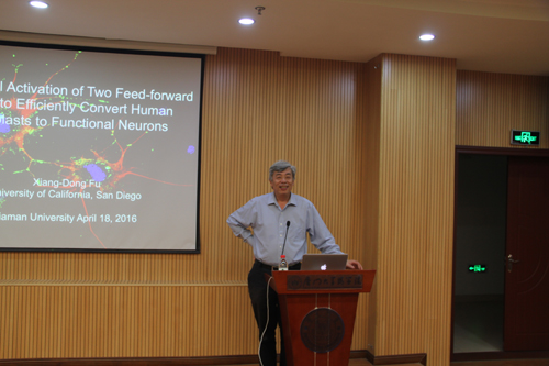 4月18日上午,现就职于美国加州大学圣地亚哥分校细胞与分子医学系的付向东教授在厦门大学药学院庄瑾楼426报告厅为我校师生作了题为“Sequential activation of two feed-forward loops to efficiently convert human fibroblasts to functional neurons”的南强学术讲座。厦门大学药学院刘文教授主持了讲座。刘教授首先代表厦门大学对付教授的到来表示了诚挚的感谢和热烈的欢迎,继而介绍了付教授的研究领域及取得的研究成果。药学院张晓坤院长等厦大教职员工与学生聆听了讲座。