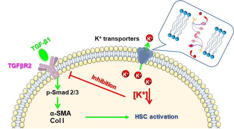 肝纤维化是肝脏受到慢性损伤后,因纤维组织异常增生而引起的病理状态。如果不及时治疗,可能会进一步发展为肝硬化,甚至肝癌。然而,目前临床上仍缺乏有效的治疗药物。大量研究表明,肝星状细胞(HSCs)的激活和异常增殖在肝纤维化进程中起着关键作用。其中,转化生长因子-β1(TGF-β1)是介导肝纤维化进展的关键细胞因子之一,当其与细胞膜上的受体(TGFβR2)结合时,会触发下游的TGF-β/Smad信号通路,进一步激活HSCs。近期研究发现,HSC胞内K+水平异常与TGFβR2的表达密切相关。鉴于此,任长亮团队提出,通过开发人工钾离子转运体来调节细胞内K+水平,有望为肝纤维化治疗提供一个新的策略。