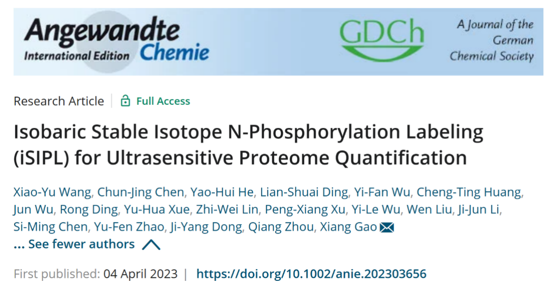 细胞应激生物学国家重点实验室、福建省药物新靶点研究重点实验室、药学院高祥副教授团队与合作者在高灵敏度蛋白质定性和定量分析技术方面取得重要进展,相关成果以“Isobaric Stable Isotope N-Phosphorylation Labeling (iSIPL) for Ultrasensitive Proteome Quantification”为题在线发表在Angew Chemie International Edition杂志(DOI:10.1002/anie.202303656)。