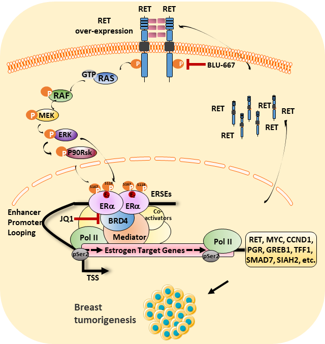 雌激素受体阳性乳腺癌是数量最多的乳腺癌亚型,占乳腺癌总数的70%左右,内分泌疗法是常用的一线疗法,然而,原发和获得性耐药是目前临床急需解决的关键问题。因此,寻找雌激素受体阳性乳腺癌新的药物治疗靶点和干预措施具有重要意义。雌激素受体阳性乳腺癌发生发展的主要原因之一就是雌激素水平紊乱导致的雌激素/雌激素受体介导的基因转录的异常激活。超级增强子是由多个相邻近的转录活性增强子组成的、驱动调控细胞身份基因表达的一个大簇,该区域富集高密度的转录因子、辅因子及增强子相关表观修饰。研究团队利用Gro-seq,ChIP-seq等高通量测序方法系统定义了雌激素受体阳性乳腺癌中的超级增强子,并进一步发现BRD4是超级增强子及其邻近靶基因转录激活所必需的。超级增强子所驱动的邻近基因转录异常和肿瘤发生发展密切相关。研究团队进一步发现超级增强子所驱动的靶基因RET在雌激素受体阳性乳腺癌的发生发展中起着极其重要的作用。机制研究发现,RET通过调控RAS/RAF/MEK2/ERK/p90RSK/ER的磷酸化级联反应调控雌激素靶基因的表达,从而构成了BRD4/ER –RET–ER正反馈循环。基于此,研究团队提出了共同靶向超级增强子调控因子BRD4和超级增强子邻近靶基因RET的联合治疗方法,该联合治疗方法能有效抑制雌激素受体阳性乳腺癌和他莫昔芬耐药乳腺癌的肿瘤生长,这为相关癌症治疗提供了新的方向和途径。