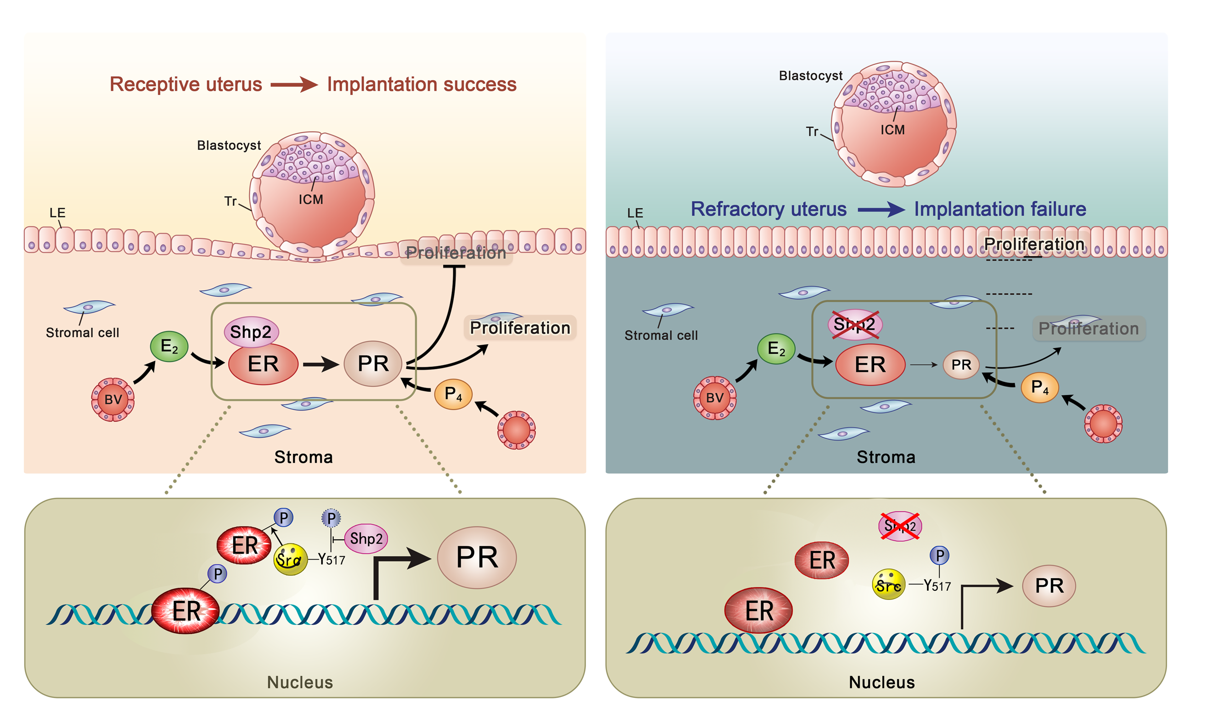 利用动物胚胎植入模型和转基因模式动物,吕忠显研究团队发现Shp2在子宫内膜细胞中特异敲除,可造成胚胎植入完全失败,雌性小鼠不育;机制研究发现,缺失Shp2阻断了子宫内膜基质细胞中的雌激素信号活性。进一步研究发现,Shp2并不像在其他细胞中主要定位于细胞质发挥功能,而是需要进入细胞核中结合雌激素受体,募集并调控Src信号蛋白对雌激素受体(ER)的活化,最终影响雌激素受体靶蛋白的转录,其中包括对子宫接受态建立关键的孕激素受体(PR)的表达调控。