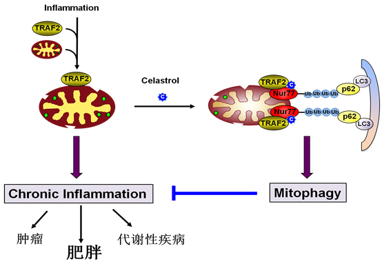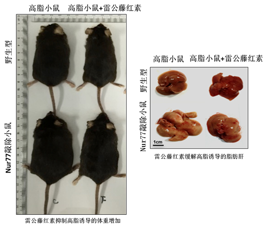 而张晓坤教授课题组最新发现,雷公藤红素能够结合于细胞核中的孤儿核受体Nur77,诱导产生特定的机理作用,清除损伤的线粒体,从而抑制炎症及肥胖等相关疾病。实验结果明显地看出,雷公藤红素有效地抑制了喂食高脂肪饮食的小鼠体重增加。
