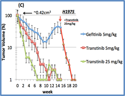 文章围绕非小细胞肺癌(NSCLC)EGFR靶向药物耐药性问题进行完整的转化医学研究:首先基于结构药物设计及分子对接技术,设计并合成了一系列特异性针对EGFR L858R/T790M耐药性突变的第三代TKI药物;其次进行该系列抑制剂的作用机理、结构及构效关系研究,结果表明,该系列药物可作为对NSCLC靶向药物Irresa/Tarceva耐药的新型治疗新药。体外肿瘤细胞群筛选及祼鼠皮下移植瘤动物模型实验结果均显示,所合成筛选的化合物是一种潜在的抑制突变型EGFR的先导化合物,尤其是由曾骥孟教授课题组自主命名的小分子抑制剂Transtinib®表现出最高的抑制活性,剂量低至5mg/kg/day就对祼鼠移植瘤(xenograft)有着明显的抑制作用(>95%)。