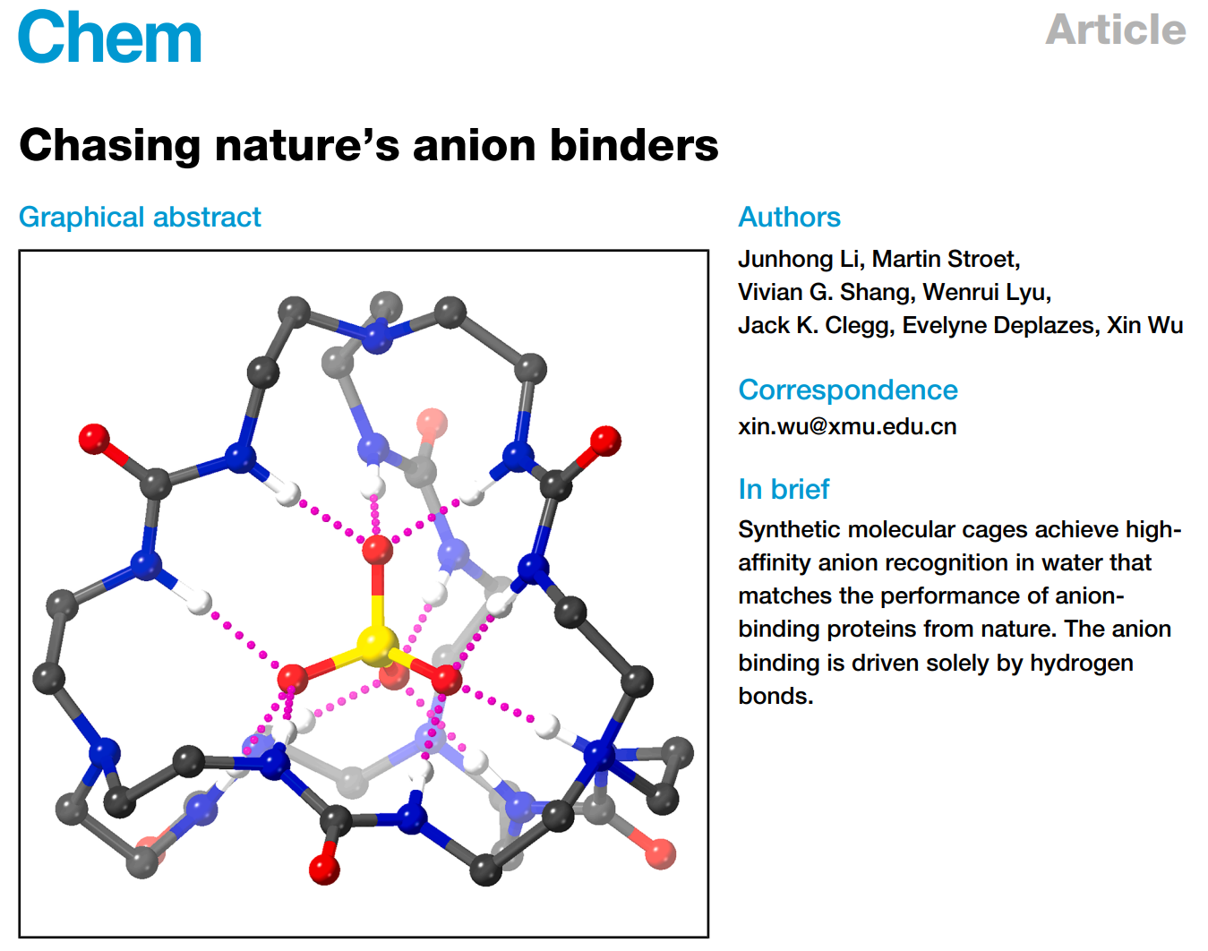 近日,厦门大学药学院吴欣教授团队在仿生阴离子识别领域取得重要进展,成功设计并合成一类新型电中性阴离子受体。该受体在水相中展现出极强的阴离子结合能力,结合常数达10⁵–10⁶ M⁻¹量级,为生物分子识别与工业废水处理等领域的应用提供了新的潜在解决方案,具有重要的科学意义与应用前景。相关成果以“Chasing nature’s anion binders”为题发表于Chem期刊。