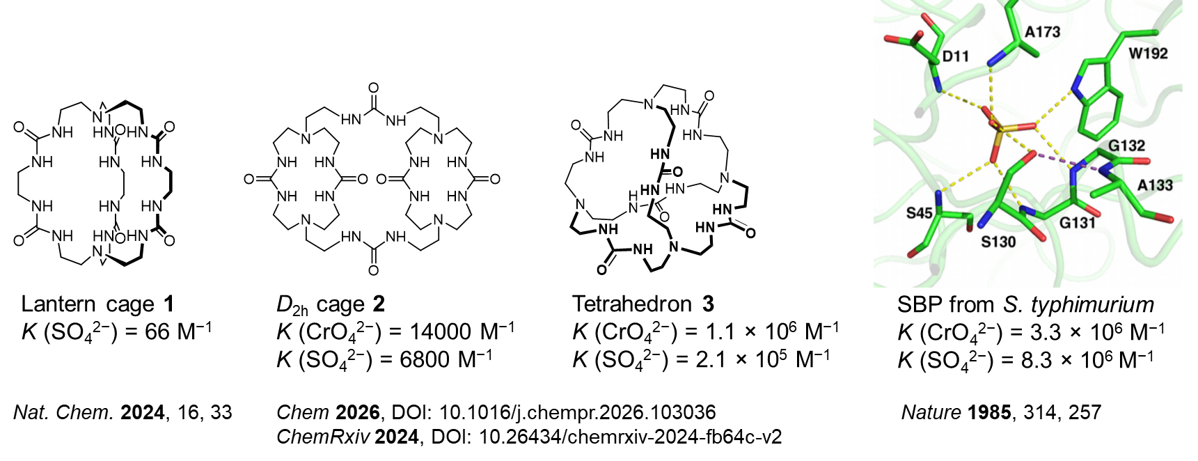 水溶液环境中,溶质分子间氢键的形成需要与大量水分子竞争,因此学界普遍认为氢键难以驱动有效的分子识别。在水相主客体体系中,氢键作用往往需要借助离子对作用或疏水效应等辅助才能实现高效结合。然而自然界中,鼠伤寒沙门氏菌(S. typhimurium)等细菌的硫酸根结合蛋白仅依靠中性氢键作用即可实现(亚)微摩尔级的高亲和力,这一天然高效结合机制,长期未能在人工合成体系中得以实现。