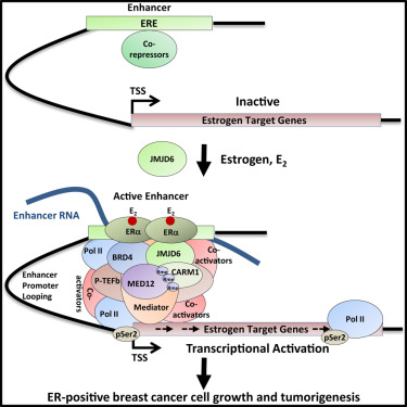 大量研究表明,在雌激素受体阳性的乳腺癌细胞中,雌激素受体通过和基因组中的增强子(enhancer)结合并且激活相应区域产生一种新型非编码RNA(增强子RNA)。增强子的激活对于邻近雌激素靶基因的转录激活至关重要。然而可供靶向的、对增强子激活至关重要的“分子开关”鲜有报道。在这项研究中,通过一系列的高通量测序和定量质谱技术,研究团队发现在雌激素受体阳性的乳腺癌细胞中,在雌激素诱导下,JMJD6能被特异性地招募到雌激素受体结合的活性增强子区域,并对增强子RNA及其邻近的编码基因的转录激活起决定性作用。进一步的机制研究表明JMJD6和Mediator复合物中的MED12相互作用,并且对MED12结合到活性增强子区域起调控作用。基于此,研究团队进一步证实了JMJD6对乳腺癌细胞的生长和小鼠体内移植瘤的形成起重要作用,并且和其酶活性密切相关。