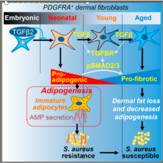 真皮成纤维细胞是皮肤深处的特化细胞,可以产生结缔组织并帮助皮肤从损伤中恢复。论文揭示了婴儿皮肤的真皮成纤维细胞具有非常高的脂肪细胞分化能力,由婴儿真皮成纤维细胞分化来的脂肪细胞,能有效抑制金黄色葡萄球菌,包括耐甲氧西林金黄色葡萄球菌的生长;但这一功能随着年龄增长慢慢消失,并在老化后消失殆尽,取而代之的是纤维化功能增加。