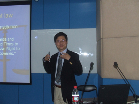 陈倜博士从专利法,专利法的结构基础,专利的申请、查询,以及专利侵权等几个方面,深层次,多角度得为大家讲解了美国专利的相关知识。期间陈博士凭借自己执业多年的经历,通过多个典型的案例同我校师生一起讨论了在专利申请过程中需要注意的问题以及怎样最大限度地保护自己的专利不被侵权,同时又可以在法律允许的范围内从专利中获益最多。