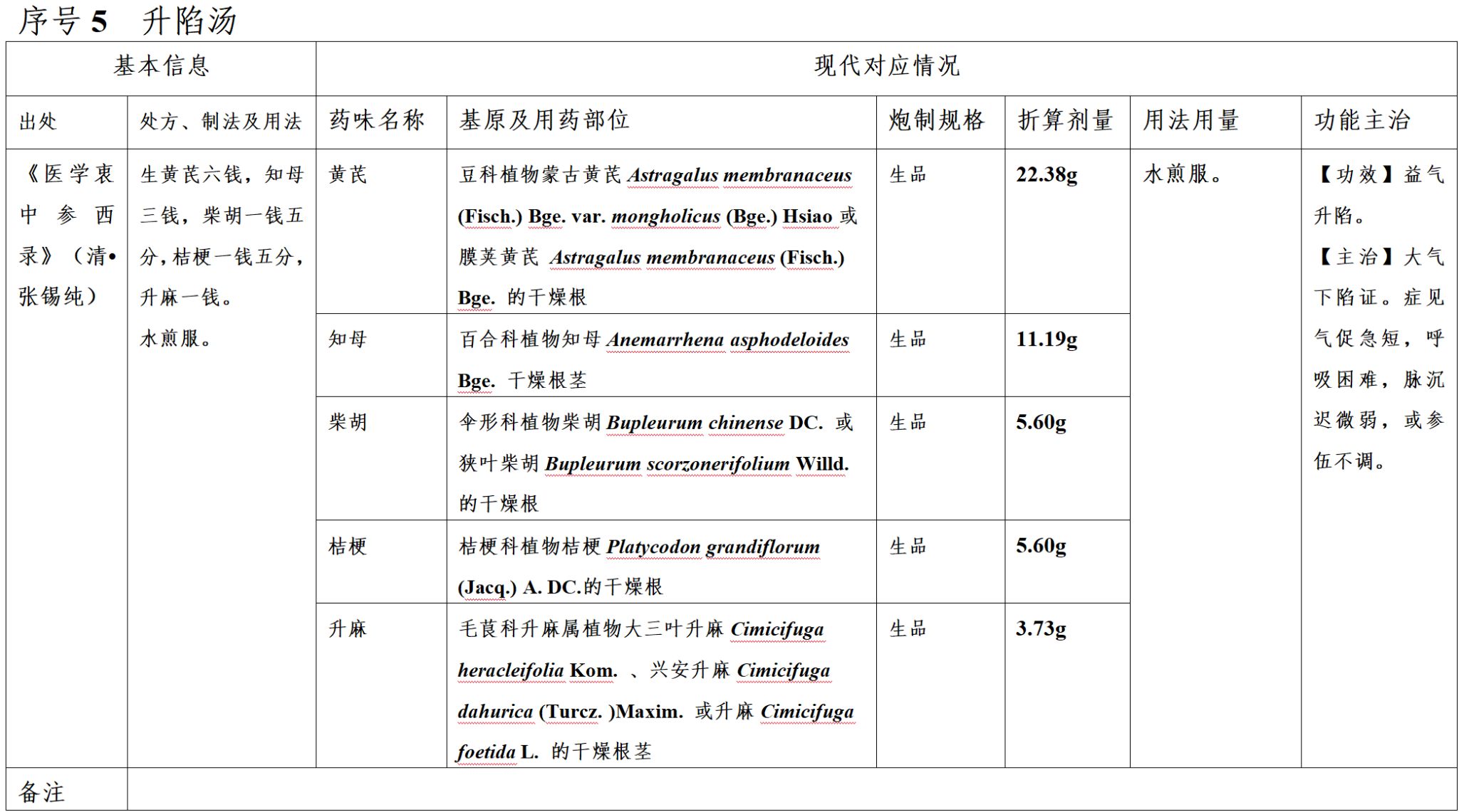 作为中药3.1类新药,升陷汤颗粒的研发严格遵循《中华人民共和国中医药法》对经典名方的开发要求,其原方源自清代名医张锡纯《医学衷中参西录》中的 “升陷汤”,由黄芪、知母、柴胡、桔梗、升麻五味中药组成,具有益气升陷的功效,是治疗大气下陷证的名家要方,临床表现为气短乏力、呼吸困难、脉沉微弱等症状。“升陷汤”是国家中医药管理局发布的《古代经典名方目录(第一批)》中的第73方以及《古代经典名方关键信息表(7首方剂)》中的第5方。