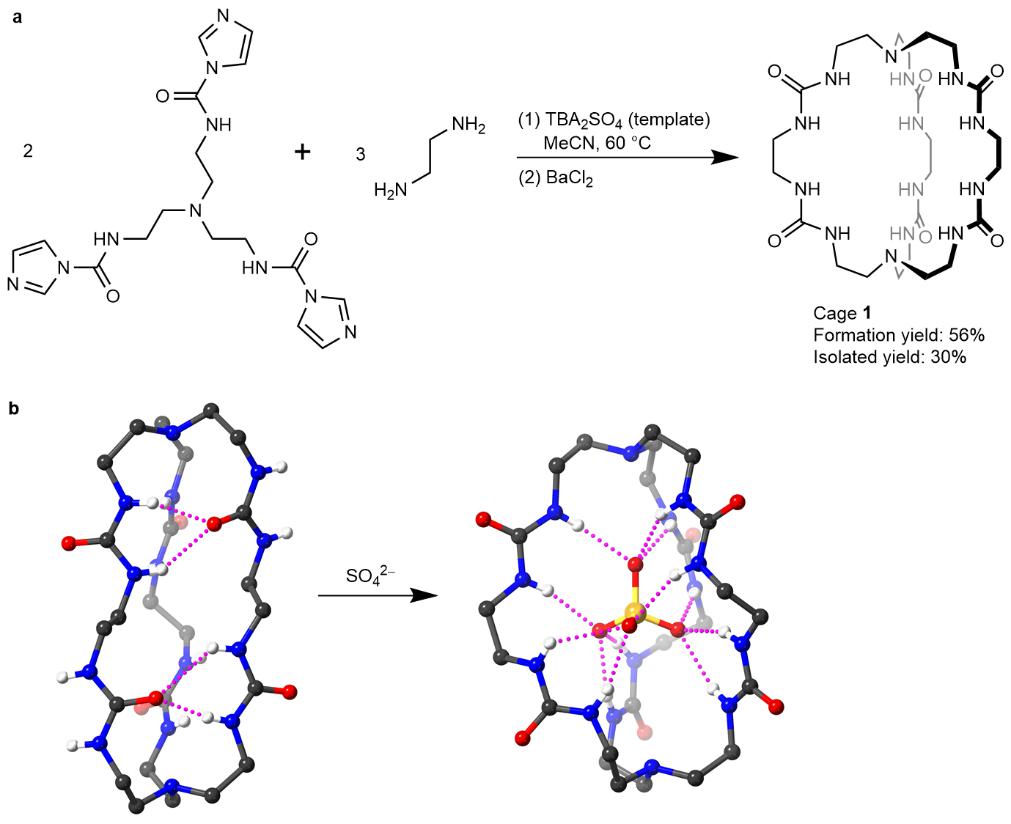 该论文报道了一类电中性寡聚脲分子笼,成功实现了水相中的选择性硫酸根识别,这类分子笼在阴离子分离和水质检测等方面亦展现出巨大的应用价值。分子笼1由廉价的试剂出发,在硫酸根模板的导向作用下一锅高效地形成,并具较高的水溶性。分子笼1能在二甲基亚砜-水的混合溶剂中以及在纯水中选择性地结合硫酸根,亲和力达到微摩尔至毫摩尔级别。X-射线晶体结构和分子动力学模拟的研究表明,空的分子笼1存在脲基⋯脲基分子内氢键和脲基⋯水分子的分子间氢键,与硫酸根结合后分子内氢键被打开,笼的6个脲基提供12个强氢键包裹高负电荷的硫酸根阴离子。多重强氢键作用导致即使在纯水中硫酸根的结合过程仍呈现有利的焓变。利用胶束提供的低极性微环境,分子笼1在水中对硫酸根的表观亲和力增强至990 M-1。分子笼1可用于分析水和饮料样品中的二价阴离子,亦可通过液-液萃取的方式高效去除水中的硫酸根。