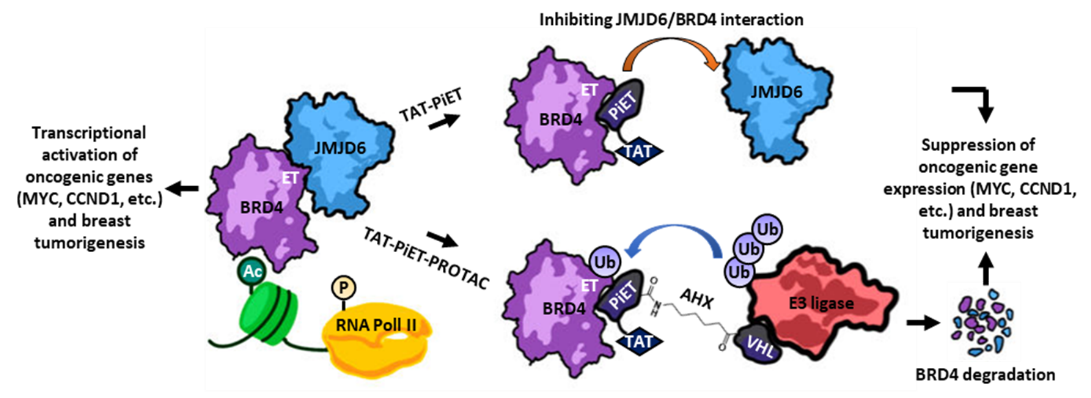 刘文教授团队前期研究发现了增强子结合的BRD4通过其ET结构域招募去甲基化酶JMJD6远程调控P-TEFb蛋白复合体的活性,从而调控邻近基因转录延伸的转录调控新模式(Cell. 2013 Dec 19;155(7):1581-95)。最近,团队发现BRD4和JMJD6是调控ERα介导的基因转录、癌细胞生长和肿瘤形成的重要蛋白因子,在ERα阳性乳腺癌的发生发展中发挥至关重要作用(Mol Cell. 2018 Apr 19;70(2):340-357.e8;Nucleic Acids Res. 2022 Oct 14;50(18):10230-10248.)。国内外同行研究也表明BRD4和JMJD6参与多种癌症的发生发展,是极具潜力的药物靶点。BRD4和JMJD6调控基因转录和参与癌症发生发展的功能既依赖于JMJD6酶活性,又依赖于两者的相互作用。基于此,团队多角度进行了相关干预手段的研究:首先是针对JMJD6的酶活性中心成药性口袋进行了大规模的活性小分子筛选,获得了多个和JMJD6结合力强、酶活性抑制率高、特异性好和癌细胞生长抑制率高的活性小分子(ACS Med. Chem. Lett. 2019 Nov 19, 10, 1609−1613; ZL201711476073.8; ZL202010973010.9)。其中名为iJMJD6的小分子在小鼠肿瘤模型中(包括雌激素受体阳性乳腺癌、三阴性乳腺癌、肝癌和结直肠癌在内的多种癌细胞来源移植瘤和PDX模型)对肿瘤生长和转移具有非常显著的抑制效果。在雌激素受体阳性乳腺癌中能有效克服内分泌药物(他莫昔芬和氟维司群)引起的耐药。药代动力学研究表明iJMJD6具有很好的成药性(PNAS. 2022 Aug 23;119 (34))。其次,研究团队针对BRD4和JMJD6蛋白相互作用展开了短肽抑制剂的筛选。团队首先通过对接分析和筛选确定了JMJD6中与ET具有最高亲和力的短肽序列,并且这一序列在体外能有效破坏BRD4与JMJD6之间的相互作用。该短肽被命名为PiET。TAT穿膜序列修饰的PiET,即TAT-PiET,在细胞中有效地阻断了BRD4与JMJD6的相互作用。进一步通过蛋白水解靶向嵌合体(PROTAC)技术修饰的TAT-PiET,即TAT-PiET-PROTAC,以ET依赖的方式降解BRD4蛋白,表明PiET特异性地靶向BRD4的ET结构域。TAT-PiET和TAT-PiET-PROTAC有效抑制了BRD4/JMJD6介导靶基因的转录激活,其中包括MYC和CCND1;有效抑制了乳腺癌细胞的生长、克隆形成、迁移和侵袭;有效抑制了小鼠移植瘤模型中的乳腺肿瘤的生长。基于之前的分子机制研究,团队进一步展示了TAT-PiET/TAT-PiET-PROTAC与JQ1、iJMJD6或ICI的联合治疗对乳腺肿瘤生长的抑制具有协同效应,并具有良好的安全性。此外,TAT-PiET/TAT-PiET-PROTAC能使他莫昔芬耐药的ERα阳性乳腺癌细胞对他莫昔芬重新敏感化。