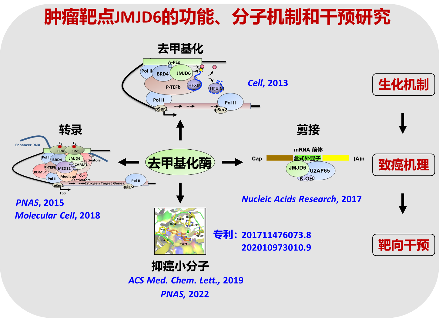 该项目是刘文教授团队聚焦加氧酶JMJD6研究工作十余年取得的阶段性重要成果:团队围绕癌细胞中表观遗传调控因子如何调控基因表达和驱动癌症发生发展这个关键科学问题,聚焦于含JmjC结构域蛋白家族中的JMJD6成员展开研究,对JMJD6生化、机制及细胞功能进行了全面评析;报道了JMJD6除了作用于组蛋白,也能作用于非组蛋白发挥功能;发现了JMJD6直接和RNA相互作用,作为RNA结合蛋白在剪接中发挥重要的作用;阐明了JMJD6在ERα阳性乳腺癌等疾病发生发展中的作用机制;针对JMJD6的酶活性中心成药性口袋进行了大规模的活性小分子筛选的研究工作,获得了多个和JMJD6结合力强、酶活性抑制率高、特异性好、癌症细胞生长抑制率高的活性小分子。这一系列工作完成了JMJD6生化机制、致病机理到干预措施的研究链条,相关原创性成果先后发表在Cell、PNAS(2篇)、Nucleic Acids Research、Molecular Cell等国际知名杂志。接下来团队将继续开拓,将已发现的具备显著转化潜力的小分子抑制剂开发为原创药物,为相关癌症治疗提供新措施。