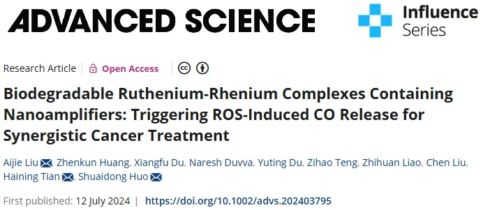 近日,霍帅东教授和刘爱洁副教授团队在Advanced Science期刊发表了题为“Biodegradable Ruthenium-Rhenium Complexes Containing Nanoamplifiers: Triggering ROS-Induced CO Release for Synergistic Cancer Treatment”的研究论文,报道了一种以钌配合物(Ru-complex)为光敏剂(PS)和铼配合物(Re-complex)作为一氧化碳(CO)释放分子(CORM)的可生物降解共聚物纳米放大器。该纳米放大器能够在光诱导下产生ROS,继而触发CO释放,用于增强抗肿瘤的协同治疗。