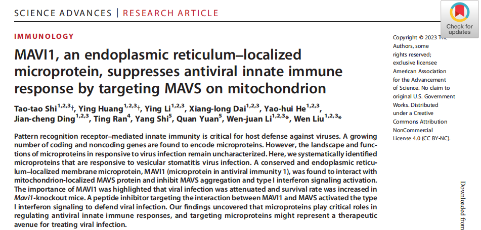 2023年9月1日,药学院刘文教授团队在Science Advances杂志在线发表了题为MAVI1, an Endoplasmic Reticulum-localized Microprotein, Suppresses Antiviral Innate Immune Response by Targeting MAVS on Mitochondrion的研究论文。该研究发现了一个定位在内质网上的微蛋白MAVI1,并揭示了其通过靶向线粒体蛋白MAVS抑制RLR-MAVS介导的I型干扰素通路的功能和机制。