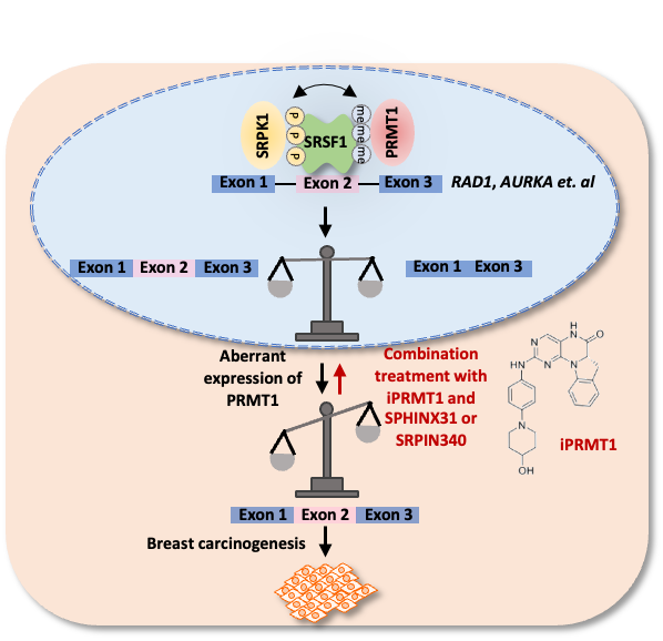 模式图:PRMT1介导的SRSF1精氨酸甲基化在基因可变剪接调控和乳腺癌细胞生长中的作用机制和靶向干预研究