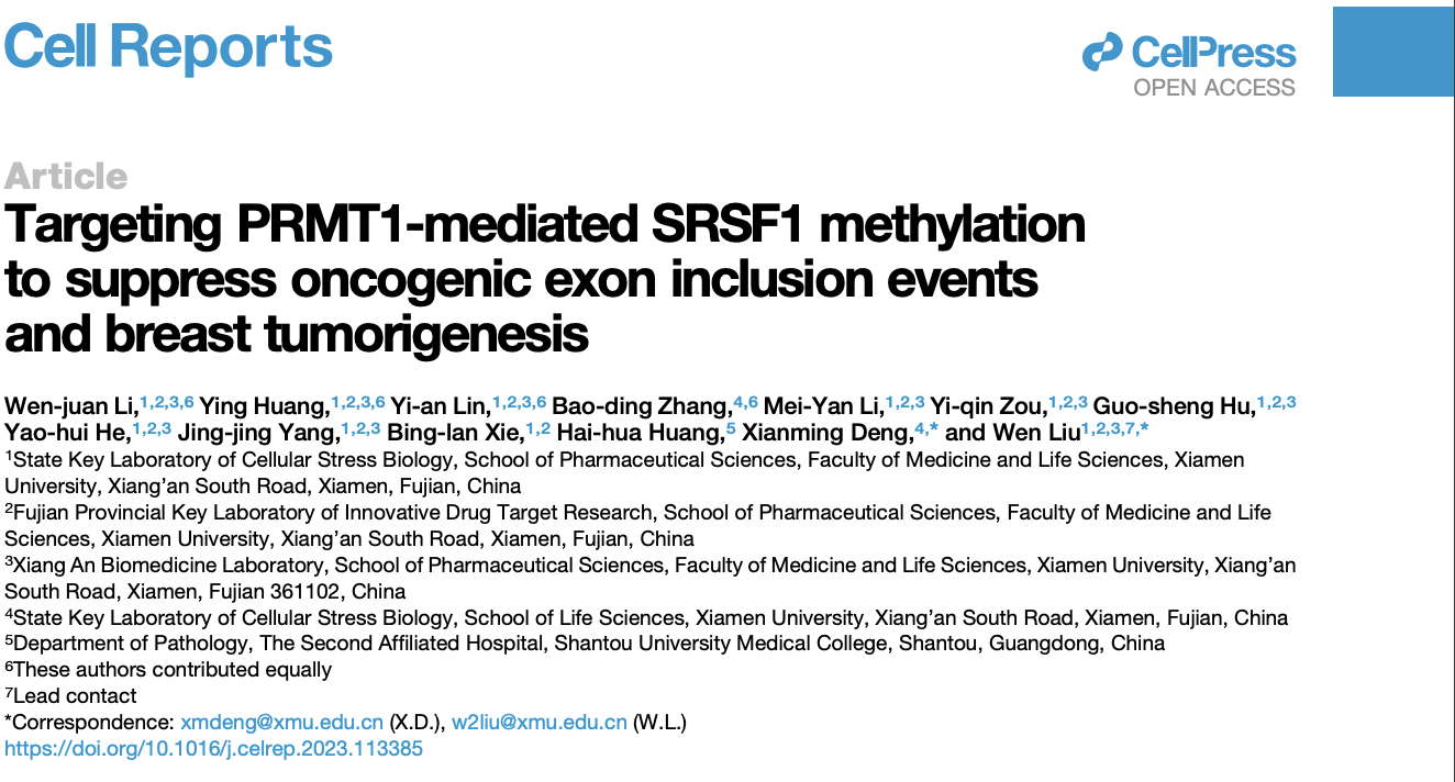 11月7日,药学院刘文教授研究团队与生命科学学院邓贤明教授研究团队合作于Cell Reports在线发表题为“Targeting PRMT1-mediated SRSF1 Methylation to Suppress Oncogenic Exon Inclusion Events and Breast Tumorigenesis”的研究成果。该研究阐述了蛋白精氨酸甲基转移酶PRMT1甲基化剪接因子SRSF1调控基因可变剪接的功能和分子机制,基于该分子机制,研究团队进一步筛选获得特异性靶向PRMT1的小分子抑制剂iPRMT1。iPRMT1单独使用对乳腺癌的生长起到有效抑制作用,联合SRSF1的激酶抑制剂(SPHINX31或SRPIN340)起到协同效果。该研究为以PRMT1为靶点的抗肿瘤药物开发,也为可变剪接紊乱所诱发的肿瘤治疗提供了新的研发角度和策略。这是继刘文教授团队在2021年揭示I型、II型和 III型PRMT介导的甲基化修饰网络及其协同调控基因剪接和促癌机制(Nature Communications,2021)之后,在精氨酸甲基化及其抑制剂开发领域的又一个重要的发现。