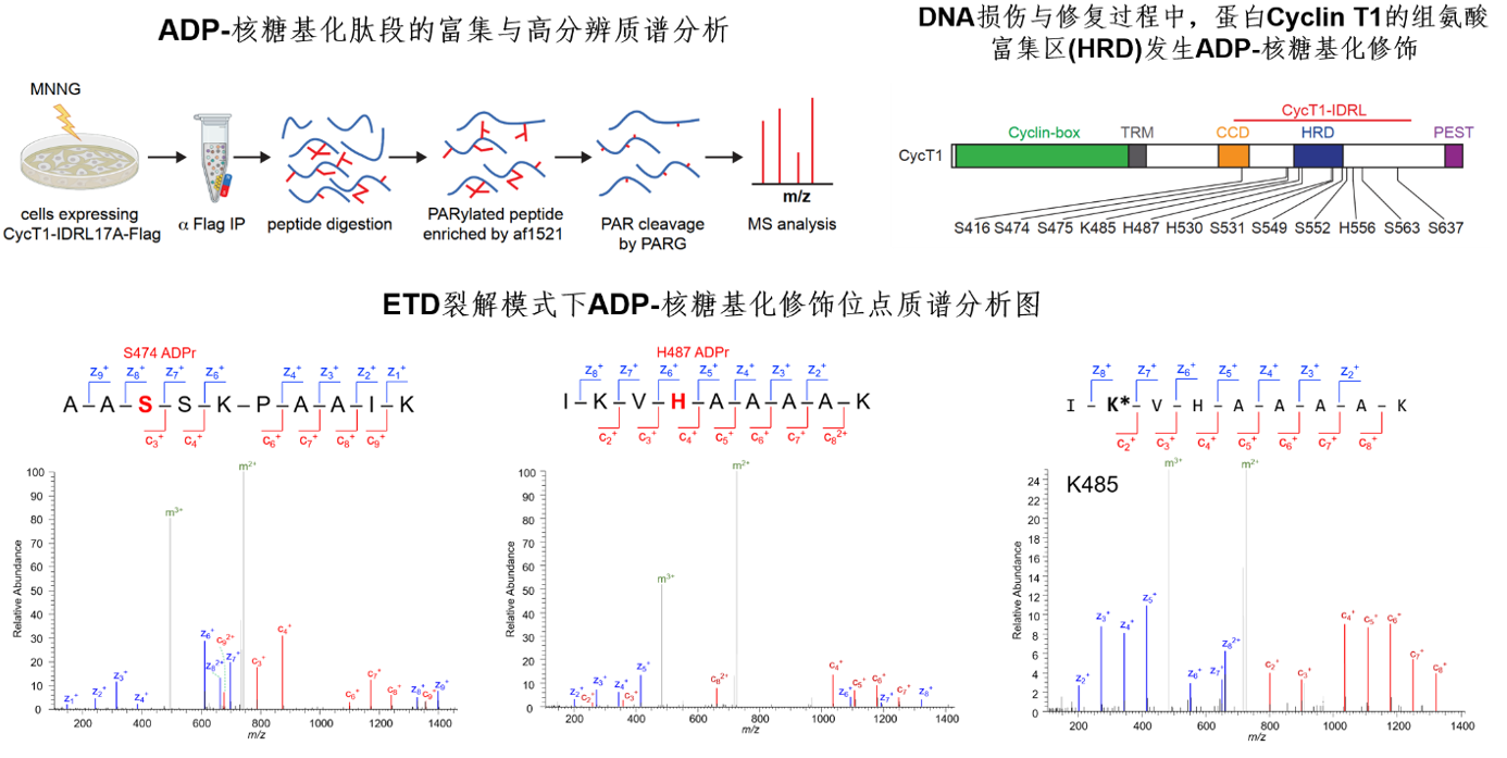 蛋白的ADP核糖基化修饰发挥着多种重要的生物功能,如DNA损伤与修复、细胞应激和免疫反应、衰老过程、肿瘤代谢等。然而,蛋白ADP核糖基化修饰的高度异质性、动态变化、含量低以及修饰本身的不稳定性等因素,使ADP核糖基化修饰的分析极具挑战。该研究依托厦门大学生物医学仪器共享平台完备的组学质谱设备,对样品富集制备方法及质谱测试参数进行了系统优化,比较了多种肽段测序裂解模式的差异,如HCD、CID及ETD(电子迁移裂解)等,建立了一套能够无偏差鉴定ADP核糖基化修饰位点的工作流程,主要包括修饰肽段的富集、PARG修剪、二级质谱ETD裂解等关键步骤。高可信度鉴定CycT1上的12个ADP核糖基化修饰位点,特别是发现较为少见的组氨酸残基ADP核糖基化的直接修饰。上述质谱分析流程将为不同生命过程中ADP核糖基化修饰的相关研究提供了重要参考。