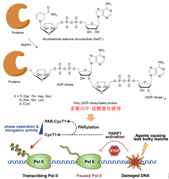 图1. CycT1的多聚ADP-核糖基化修饰调控DNA损伤后的转录沉默机制示意图