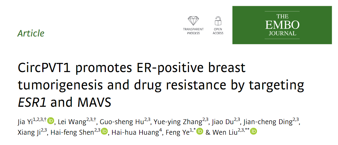 2023年4月3日,刘文教授课题组与厦门大学附属第一医院叶峰教授课题组联合在The EMBO Journal杂志上发表题为“CircPVT1 promotes ER-positive breast tumorigenesis and drug resistance by targetingESR1 and MAVS”的研究成果。该研究发现,环状RNA circPVT1在乳腺癌中高表达,通过靶向ESR1 mRNA和MAVS蛋白双重作用机制促进乳腺癌发生发展。