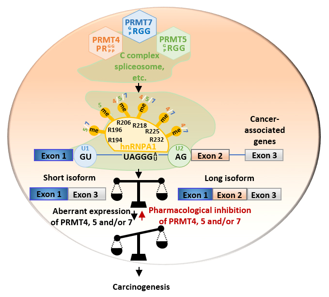 研究团队利用高分辨率质谱系统地鉴定了细胞中PRMT7的精氨酸甲基化底物(甲基组,methylome),并与PRMT4和PRMT5的底物进行了比较分析,首次揭示了I型、II型和III型PRMT介导的甲基化修饰网络。基于所鉴定到的甲基化底物,研究团队集中研究PRMT4,5和7协同甲基化修饰RNA剪接因子hnRNPA1从而调控癌症相关基因剪接和促癌的功能和分子机制。