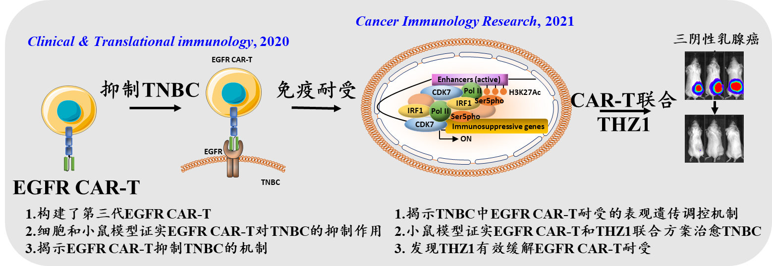 百年校庆之际,药学院刘文教授团队连续在Clinical & Translational Immunology和Cancer Immunology Research杂志上发表论文报道了一种靶向表皮生长因子受体(Epidermal growth factor receptor,EGFR)的新型嵌合抗原受体T细胞(CAR-T细胞)在小鼠肿瘤模型中能有效地抑制三阴性乳腺癌(Triple-negative breast cancer,TNBC),其与表观遗传调控因子CDK7抑制剂联合使用甚至达到治愈效果。