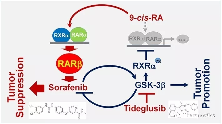 有趣的是,目前广泛用于治疗晚期肝癌的药物索拉菲尼(Sorafenib)的耐药可能与其激活肝癌细胞中的GSK-3β活性有关,该研究联合一种新型的GSK-3β抑制剂Tideglusib,可增强索拉菲尼的抗癌效果,而联合9-顺-视黄酸和Tideglusib,具有协同增强索拉菲尼的抗癌效果,这种抗癌增效是由RAR的诱导所介导的。