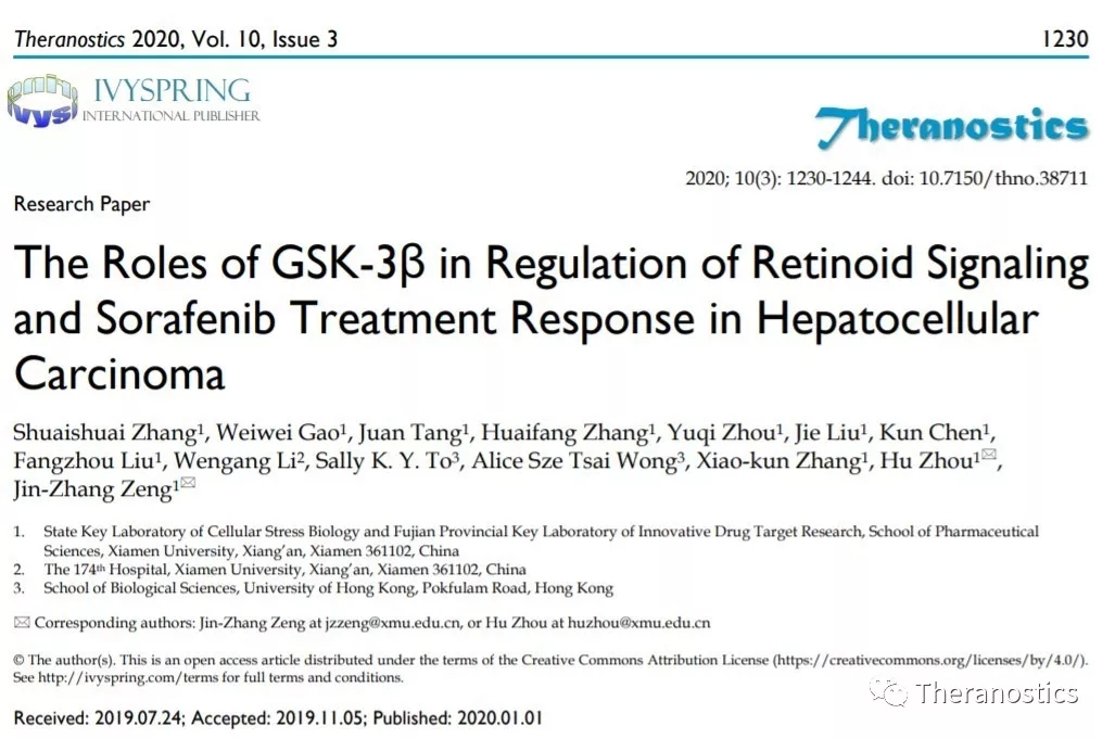 Zhang S, Gao W, Tang J, Zhang H, Zhou Y, Liu J, Chen K, Liu F, Li W, To SKY, Wong AST, Zhang Xk, Zhou H*, Zeng JZ*. The Roles of GSK-3β in Regulation of Retinoid Signaling and Sorafenib Treatment Response in Hepatocellular Carcinoma. Theranostics 2020; 10(3):1230-1244.