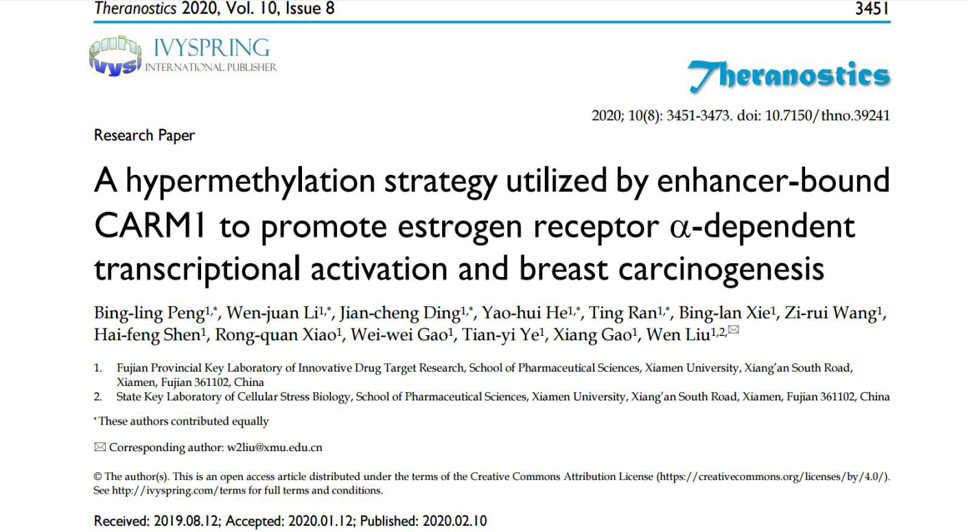 Bing-ling Peng, Wen-juan Li, Jian-cheng Ding, Yao-hui He, Ting Ran, Bing-lan Xie, Zi-rui Wang, Hai-feng Shen, Rong-quan Xiao, Wei-wei Gao, Tian-yi Ye, Xiang Gao, Wen Liu. A hypermethylation strategy utilized by enhancer-bound CARM1 to promote estrogen receptor α-dependent transcriptional activation and breast carcinogenesis.Theranostics. 2020; 10(8): 3451-3473.