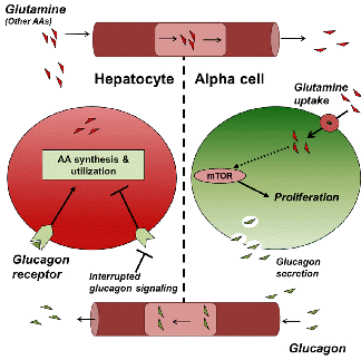 该论文以小鼠、斑马鱼为模型,并结合人胰岛α细胞为研究对象,运用转录组学、蛋白质组学及代谢组学等手段。揭示了α细胞增生过程中,肝脏中的氨基酸代谢引起变化,并促使血液循环中的游离氨基酸显著提高,其中的增加的L-谷氨酰胺是促进α细胞增生的主要因子之一。该论文解决了长期以来该领域的一个疑团即α细胞增生的驱动分子,为以胰高血糖素受体(GCGR)为靶点的糖尿病治疗手段,以及诱导增生α细胞转化成胰岛β细胞的糖尿病治疗手段提供了理论基础。