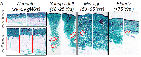 对不同年龄段人皮肤切片的组化分析发现新生婴儿皮肤里有很厚的脂肪层但随着年龄增长皮下脂肪逐渐消失并被纤维化组织取而代之