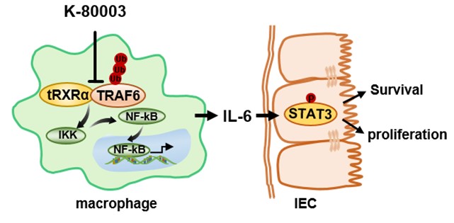 进一步研究发现,tRXRα在肠炎肠癌组织中促进炎症因子IL-6和TNFα的上调、巨噬细胞浸润的增加以及STAT3的激活。利用tRXRα-flox小鼠与lysM-cre小鼠交配获得的炎症细胞特异过表达tRXRα小鼠,验证tRXRα在炎症细胞的促瘤作用。分子机制的研究阐释了tRXRα在炎症细胞中与TRAF6相互作用,促进TRAF6的泛素化、IκBα的降解和NF-κB信号通路的激活。NF-κB信号通路是一个经典的炎症信号,可以调控炎症因子IL-6和TNFα的表达。IL-6的上调可以促进STAT3的激活,从而促进肠肿瘤细胞的增殖。
