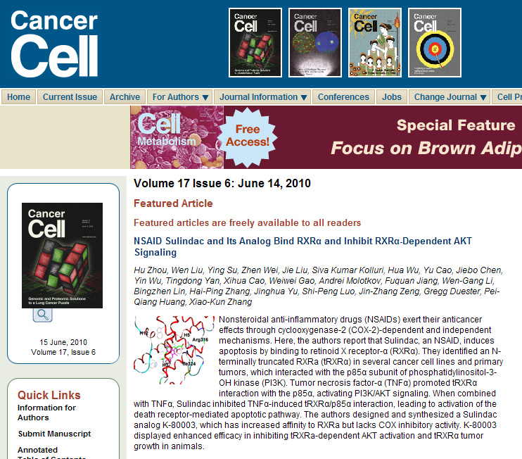 我院张晓坤教授课题组日前发明了一种名为“K-80003”新型的抗癌药物分子,实验表明,当这个分子作用于癌细胞中特有的靶分子“tRXRα”蛋白时,不但能够抑制癌细胞生长,而且还能激活体内其他细胞因子杀灭癌细胞。最新出版的肿瘤学国际顶级学术期刊《癌细胞》杂志(Cancer Cell,影响因子25.288)以特载文章的形式,发表并着重推荐了这一重大研究成果。