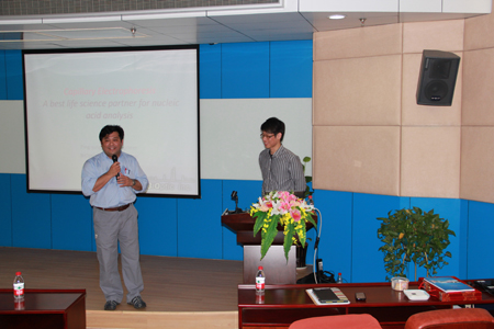 4月11-12日,应我院曾骥孟教授的邀请,台湾光鼎生物科技有限公司(BiOptic Inc)谢秉融工程师到我院进行毛细管电泳技术交流,以及介绍现代全自动化毛细管电泳仪(Qsep100)的应用及优越性,给我院汇报了一场精彩的学术报告-A best life science partner, Capillary Electrophoresis, for nucleic acid analysis。报告结束后,同学们纷纷就自己相关实验问题向谢工程师请教,整个报告会场气氛活跃。谢工程师这次到来,不仅让我们深入了解了电泳技术的发展、毛细管电泳技术的应用和优点,更重要的是,将毛细管电泳技术带进大家的实验设计,毛细管电泳技术是核酸分析中的一项重要技术。
