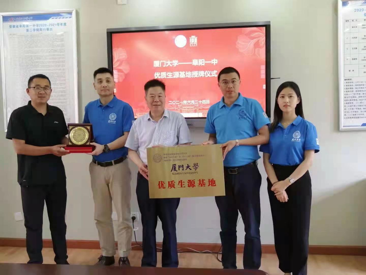 在阜阳一中,副校长刘凤君、教务处主任李冰参加了授牌仪式。杜超介绍了厦门大学百年校庆的盛况,重点解读了厦门大学今年面向安徽省的相关招生政策,并对阜阳一中输送一批又一批优秀学子到厦门大学表示祝贺和感谢。刘凤君介绍了阜阳一中学生近几年的高考成绩及志愿填报情况,表示厦门大学是阜阳一中优秀学子心目中的梦想校园。希望两校进一步加强合作衔接,共育英才。