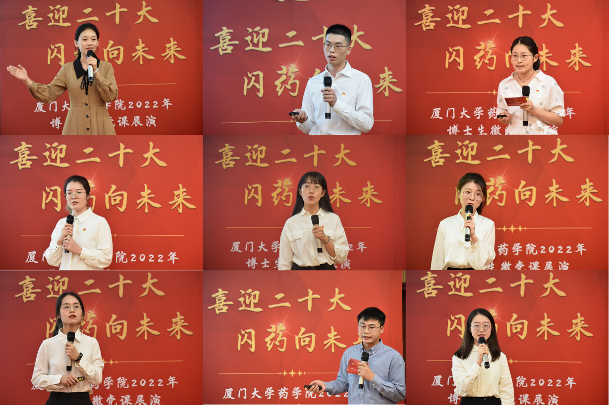金秋十月,丹桂飘香。为迎接党的二十大胜利召开,10月13日下午,药学院博士生第一党支部、第二党支部在庄瑾楼426报告厅举办“喜迎二十大,闪药向未来”药学院博士生微党课展演活动。翔安校区管委会副主任马龙,学生工作处副处长高斌,药学院党委书记宋友良,药学院副院长(主持工作)、博士生导师刘文教授,党委副书记杜超、黄旻敏,药学院副院长、博士生导师陈海峰教授、吴云龙教授,博士生导师代表吴彩胜副教授、陈思明副教授,微党课指导老师,各学生党支部委员,药学先锋班全体成员以及全体博士生参加活动。展演由2019级博士生高硕、2020级博士生许倩楠主持。