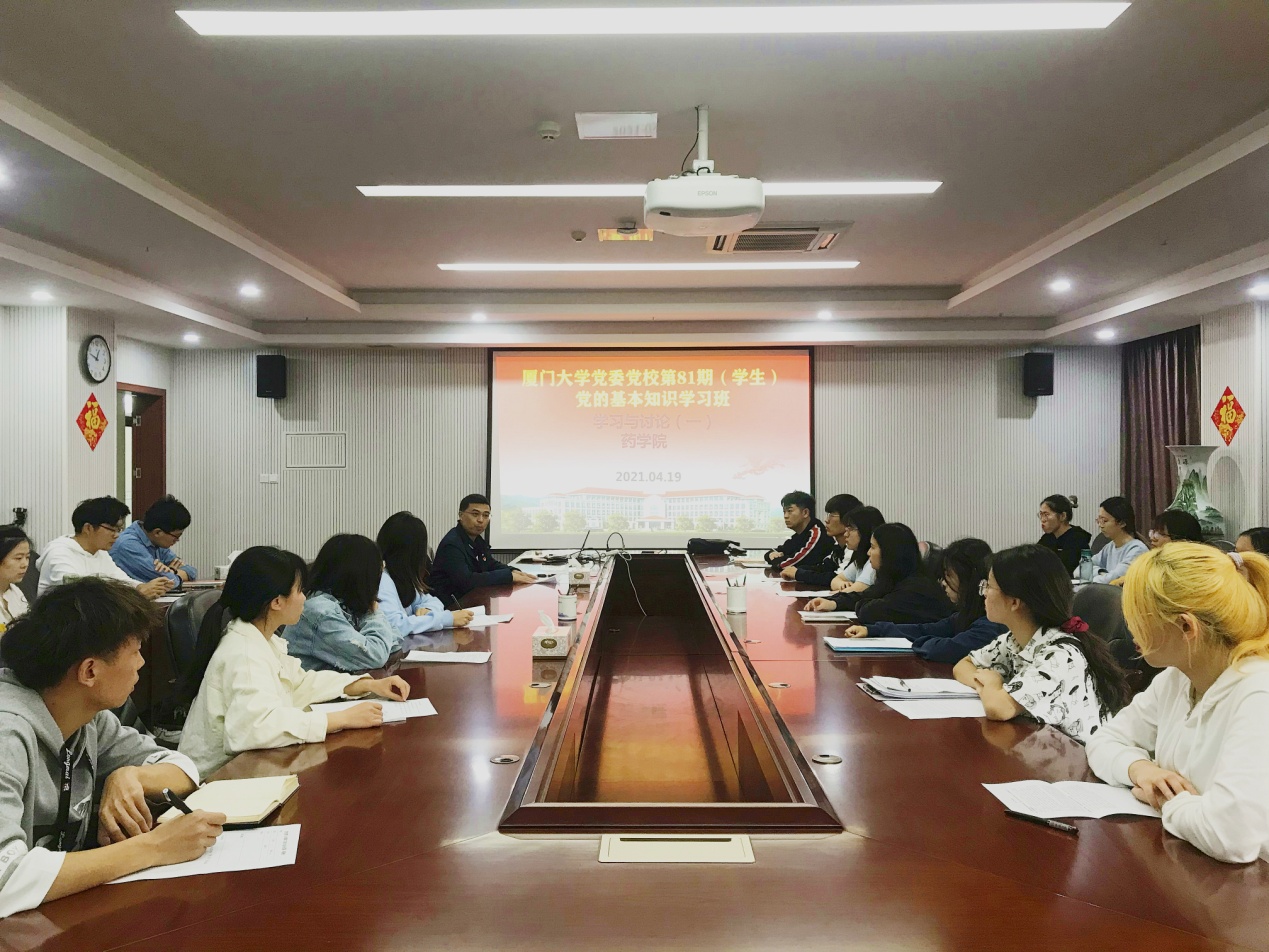 4月20日中午,药学院第81期党的基本知识学习班全体学员在庄瑾楼520会议室开展学习讨论。会议由党校带队老师范荣主持,药学院党委副书记杜超参加并讲话。
