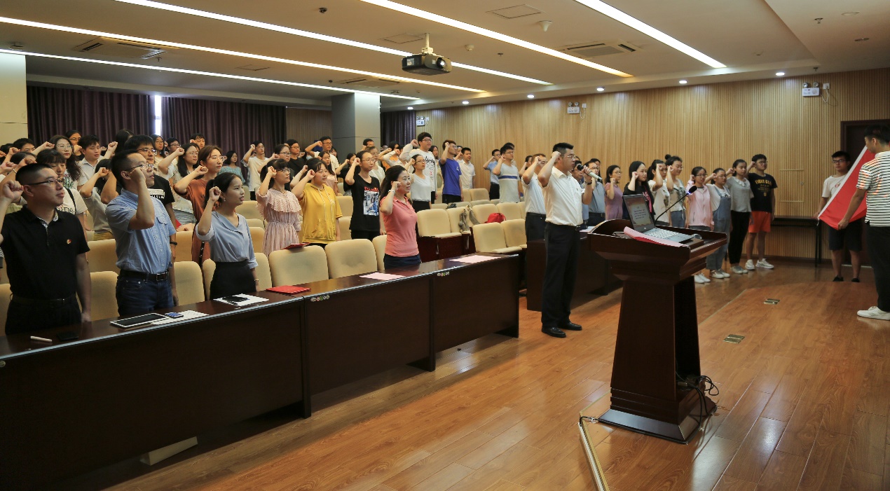 下一个环节是新党员入党宣誓及老党员重温入党誓词,由学院党委书记陈怀锋领誓。在鲜红的党旗下,全体党员庄严地举起右拳,宣读誓词“我志愿加入中国共产党,拥护党的纲领,遵守党的章程,履行党员义务……。”一句句誓词,让党员铭记党的性质与宗旨,激荡内心情怀。