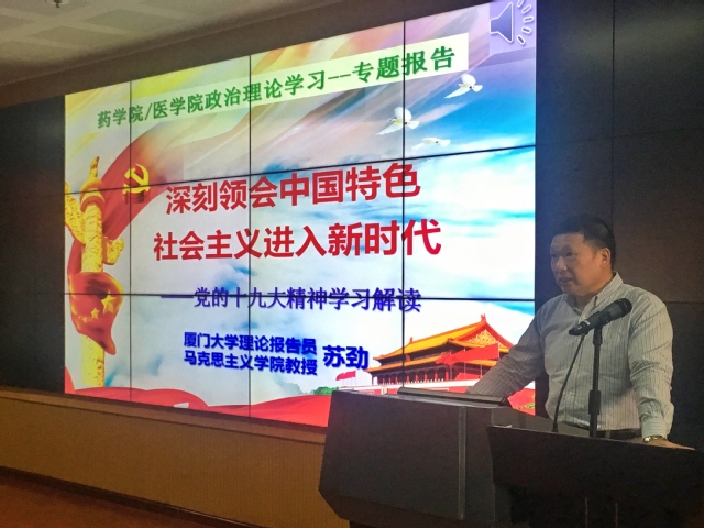 12月4日下午3时,由药学院和医学院联合举办的学习贯彻十九大精神暨政治理论学习专题报告会在五号楼临床技能中心A208顺利进行。本次报告会邀请校理论报告员、马克思主义学院苏劲教授做《深刻认识中国特色社会主义进入新时代——党的十九大精神学习解读》专题辅导,药学院、医学院全体教职工和部分学生党员参加学习。会议由药学院党委副书记丁昌利主持。
