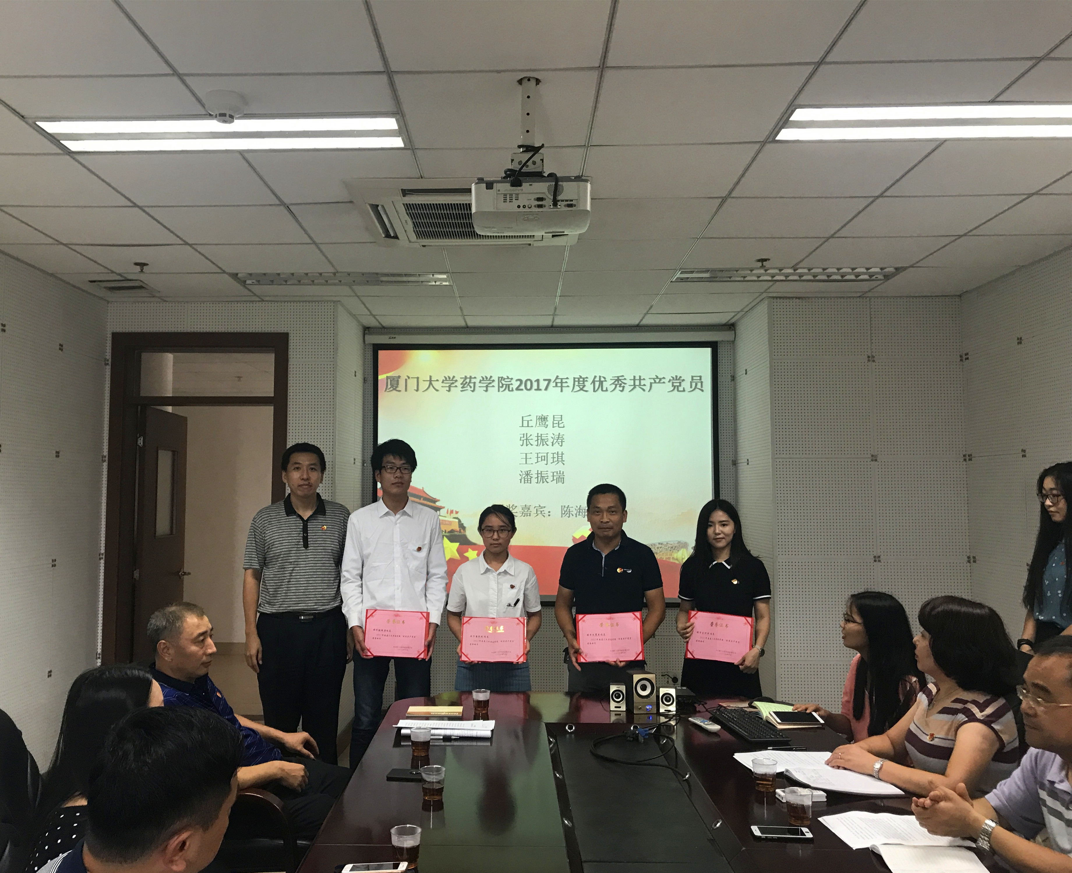 为庆祝中国共产党成立96周年,7月6日中午,厦门大学药学院党委在庄瑾楼538举行七一表彰暨“两学一做”学习教育常态化制度化交流座谈会。学院党委委员,辅导员,学生党支部书记、委员,以及受表彰的先进党支部代表、优秀党员、优秀党务工作者参加了大会。大会由学院党委副书记丁昌利主持。