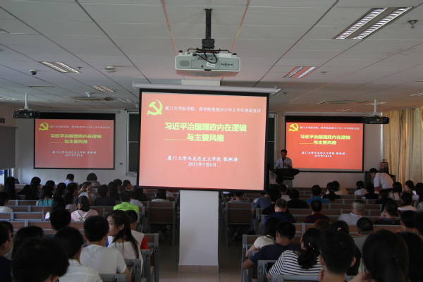 为进一步学习贯彻落实全国高校思政工作会议精神,2017年7月6日下午,药学院党委与医学院党委联合举办《习近平治国理政内在逻辑与主要风格》专题报告,报告由马克思主义学院副院长张艳涛教授主讲,学院领导班子成员和师生党员聆听了报告。