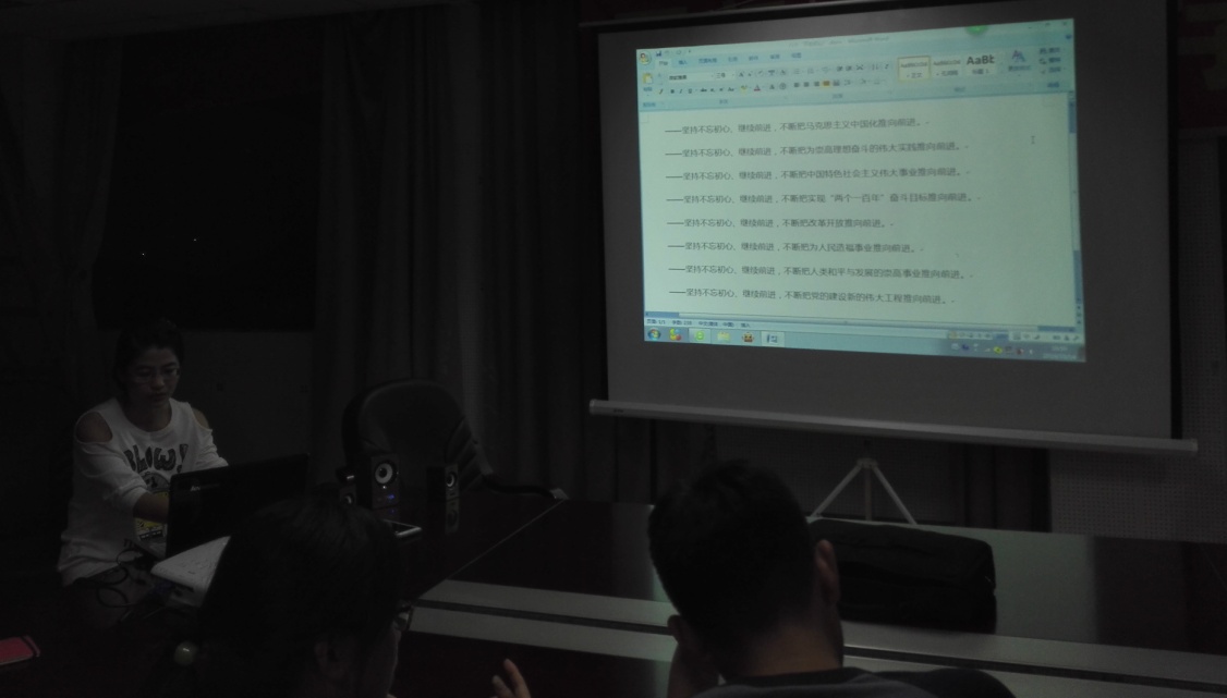 首先,大家一起观看了《不忘初心 继续前进 始终践行党的根本宗旨》的演讲视频,该演讲就走正“一条道路”、警醒“两种前途”、跨越“三个陷阱”、贯彻“四个全面”、做到“五个坚持”等五方面展开,高度概括总结了习近平总书记“七一”重要讲话精神的基本要点。通过幽默又略带批判性的口吻进行剖析,使我们更好更深刻地理解讲话精神。