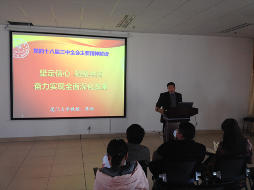 讲座中,苏劲教授指出,十八届三中全会作出了全面深化改革的决定,表明我国新一轮改革在新的历史起点上正式启动,改革的力度将是前所未有的。他运用生动的实例、丰富的资料、精辟的语言,紧密联系十八届三中全会《中共中央关于全面深化改革若干重大问题的决定》的重大思想观点、重大理论创新和重大战略部署,从“充分认识全面深化改革的重大意义,准确的把握全面深化改革的总部署”等几个方面,结合自己的理论研究,对我国未来的改革之路进行了诠释和解读。苏劲教授的报告既有理论的高度深度,又有很强的现实针对性,对更好地学习、领会、把握三中全会精神实质,客观准确地把握全会提出的新思想、新论断、新举措,将起到重要的促进作用。
