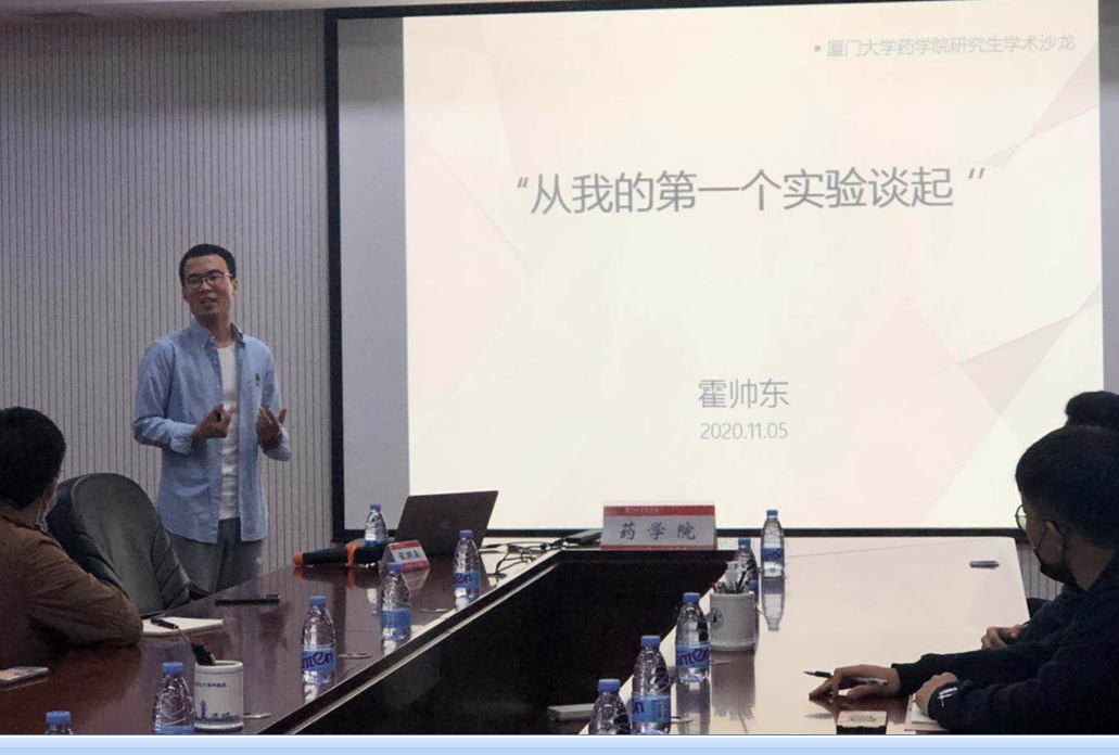 11月5日晚7:00,药学院第三期研究生学术沙龙在庄瑾楼520会议室如约而至。此次活动邀请到厦门大学“南强青年拔尖A类人才”、药学院霍帅东教授担任主讲嘉宾。通过前期线上报名,药学院30余名研究生参与其中,活动由2020级硕士研究生尹思航主持。