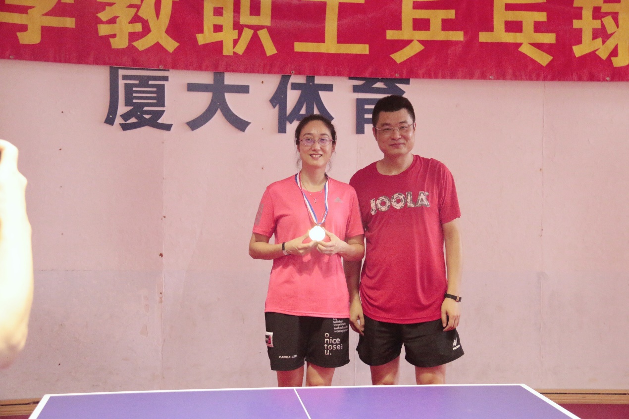 11月21日,学校举行厦门大学第13届“乒协杯”教职工乒乓球男女单打比赛。药学院教工徐阳参加女子组比赛,陈怀锋参加男子组比赛。经过数轮激烈交锋,最终徐阳荣获女子单打冠军,陈怀锋荣获男子单打亚军。