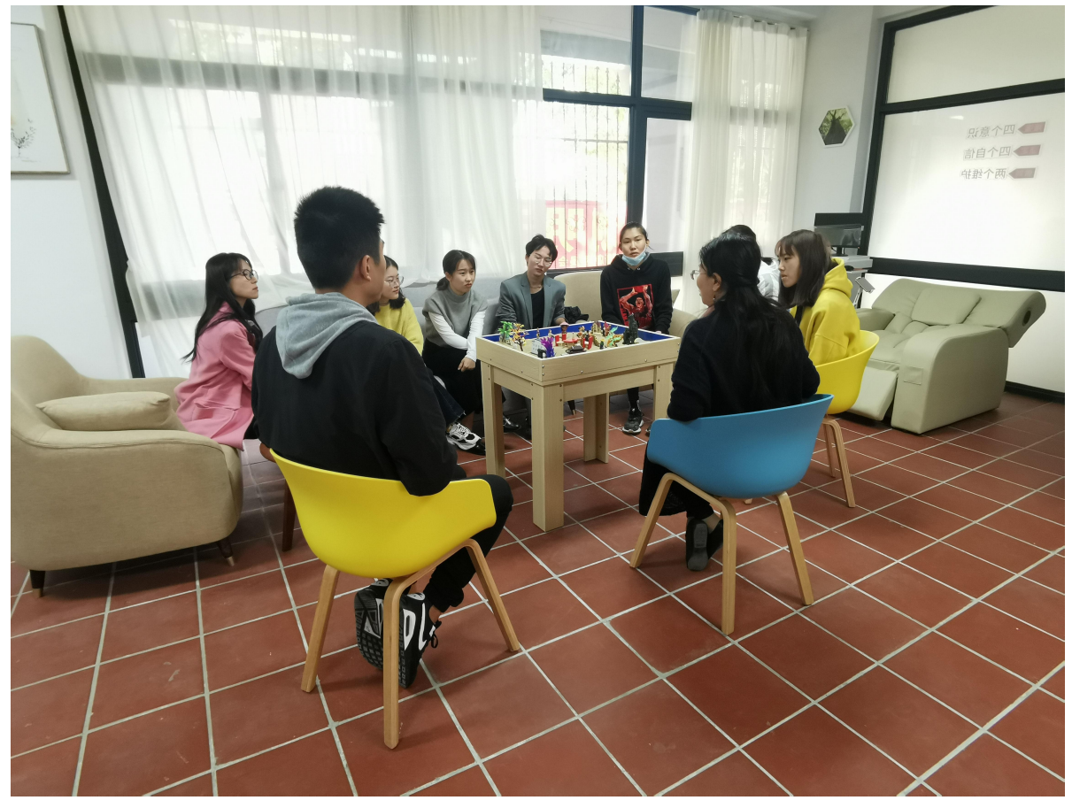 活动开始,廖彬彬引导同学们进行自我介绍,伴随着舒适轻松的室内环境,同学们在相互交流中拉近了彼此之间的距离。廖彬彬详细介绍心理沙盘操作规则:8人为一组,通过随机抽签确定每个参与者的次序,每人每轮仅能完成一次操作,过程中需维持安静的环境,由治疗师全程观察、记录。