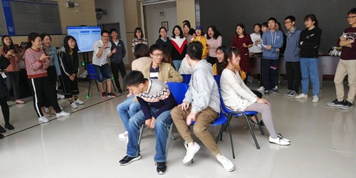 活动于下午2点开始,共由八个小游戏串联起来。暖场游戏“萝卜蹲”让不太熟悉的同学们抛开了害羞,迈出沟通交流的第一步;“叠报纸”让参与的同学们逐渐消除彼此间的生涩,紧密相拥、通力合作;“一块五毛”瞬间点燃了现场火热的气氛,让男生纷纷变身人气王;“心心相印”让同学们大胆释放表演天性,现场气氛融洽、充满欢声笑语;“抢凳子”让大孩子们光明正大地体验了一把儿时抢东西的乐趣;在之后的“一圈到底”、“比长短”、“口口相传”的游戏中,现场此起彼伏的欢笑声持续不断,吸引了不少的师生驻足观看。