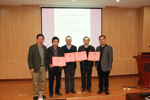 最后,学院党委副书记丁昌利宣读药学院对2014年度在教学、科研工作中做出突出贡献的教师的表彰决定。薛玉花、徐阳两位老师获得教学成果先进个人。丘鹰昆获论文成果奖,王团老、吕忠显获得科研绩效奖。张晓坤院长和学院党委书记黎永强为获奖教师颁奖并合影留念。