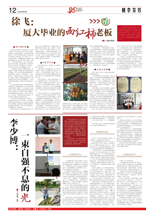 近日,台海网、《海峡都市报》闽南网、《厦大青年报》等媒体刊发我院毕业生徐飞的主题报道,对其出色的创业成绩予以肯定的评价。