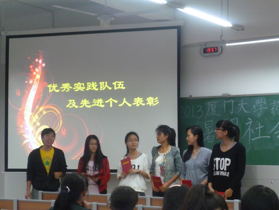 去年,药学学子赴东阿阿胶公司暑期社会实践队被评为“厦门大学2012年暑期社会实践活动优秀团队”,陆海生、韩可珂、刘晓云、王婧怡、赵金、谢娟娟等同学被评为“厦门大学2012年暑期社会实践活动积极分子”,接受了陈国全老师的颁奖。